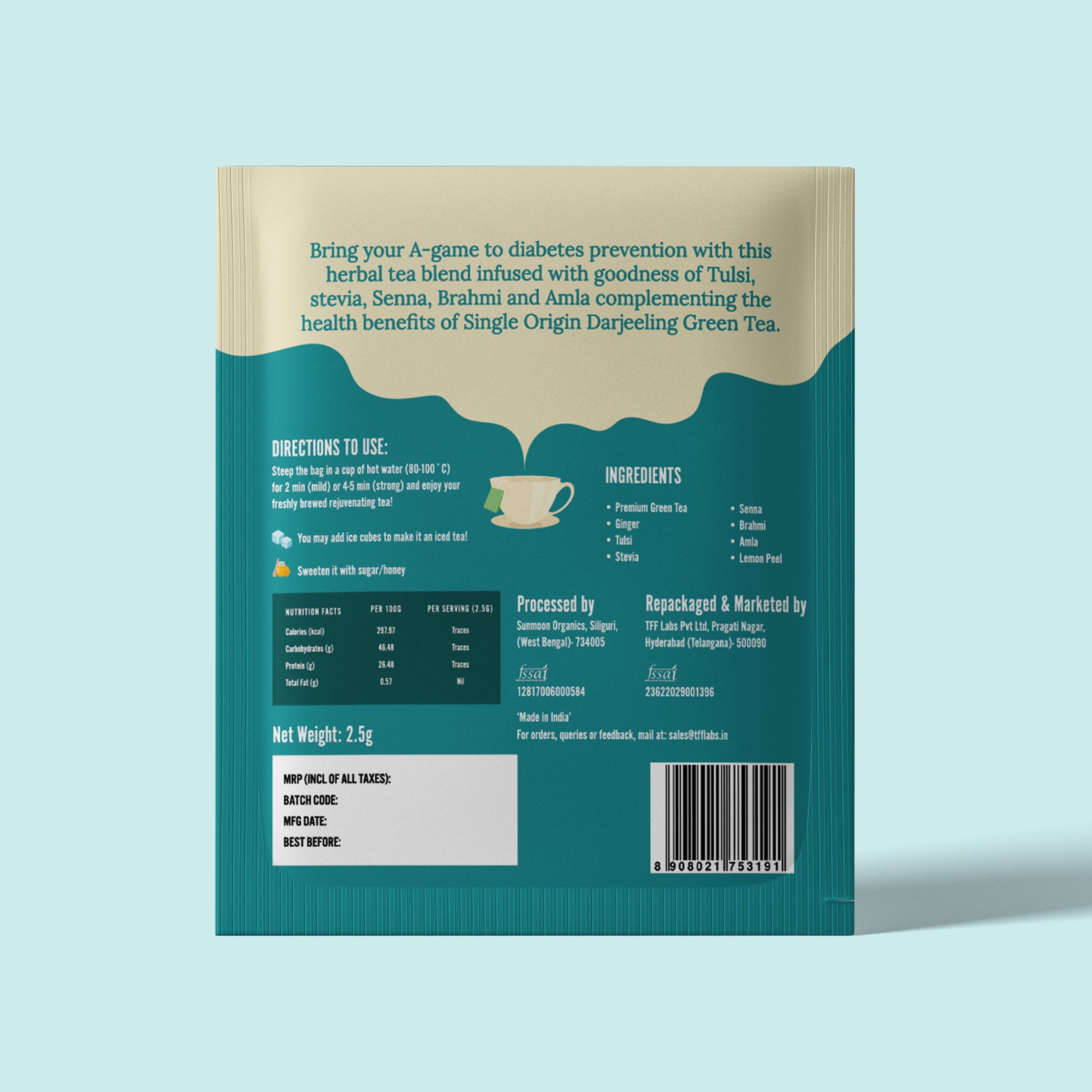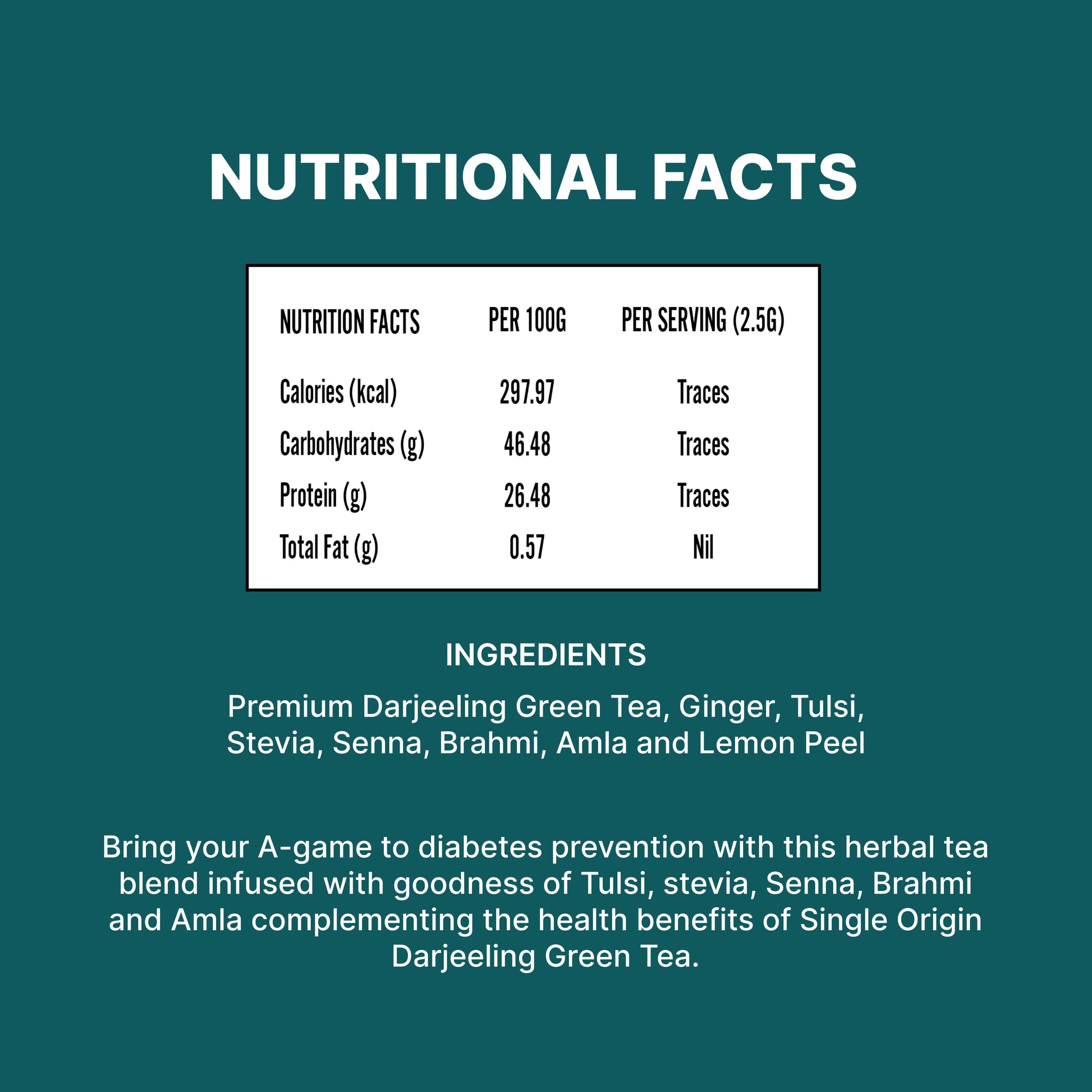 Bring your A-game to diabetes prevention with this herbal tea blend infused with goodness of Tulsi, Stevia, Senna, Brahmi and Amla complementing the health benefits of Single Origin Darjeeling Green Tea