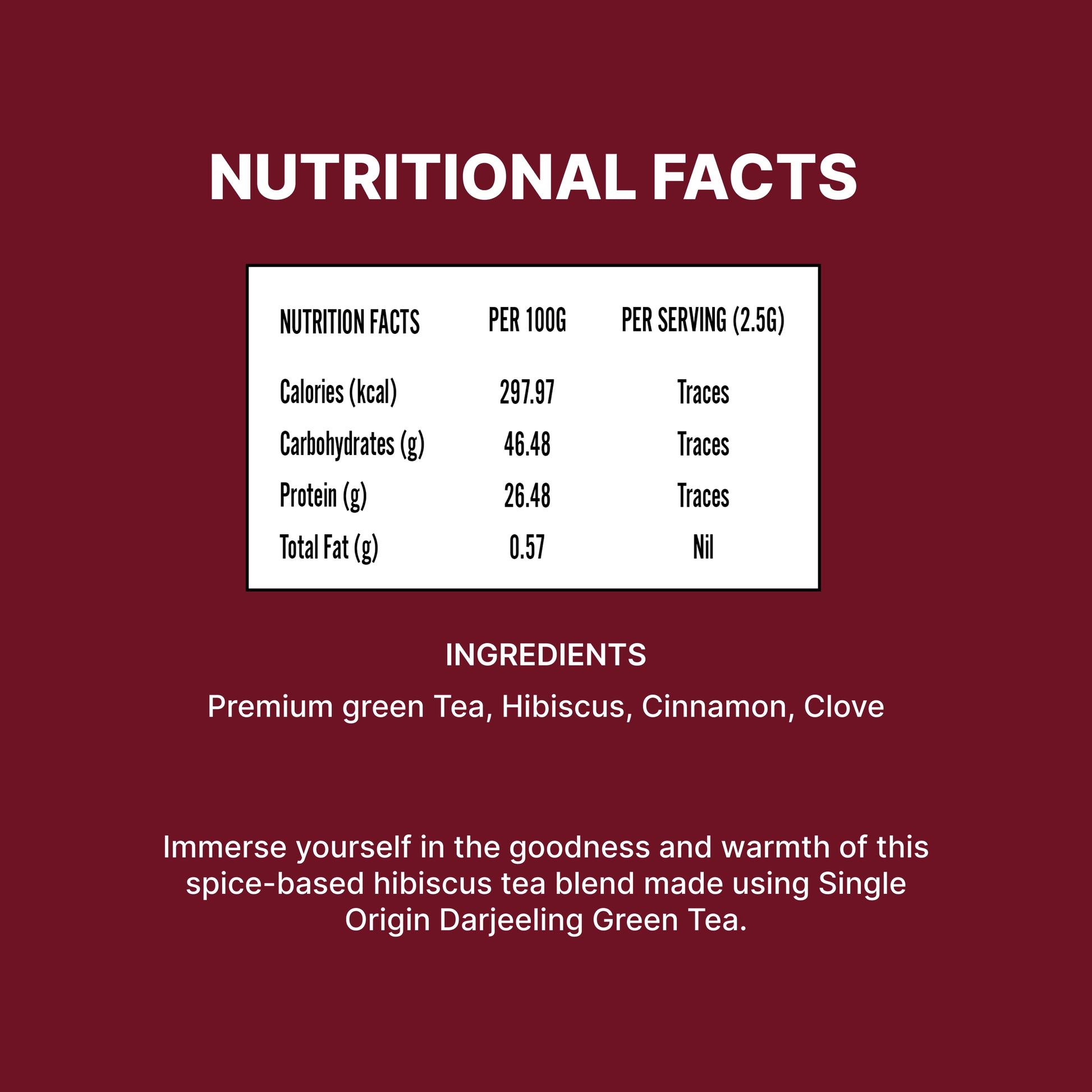 Immerse yourself in the goodness and warmth of this spice-based hibiscus tea blend made using Single Origin Darjeeling Green Tea