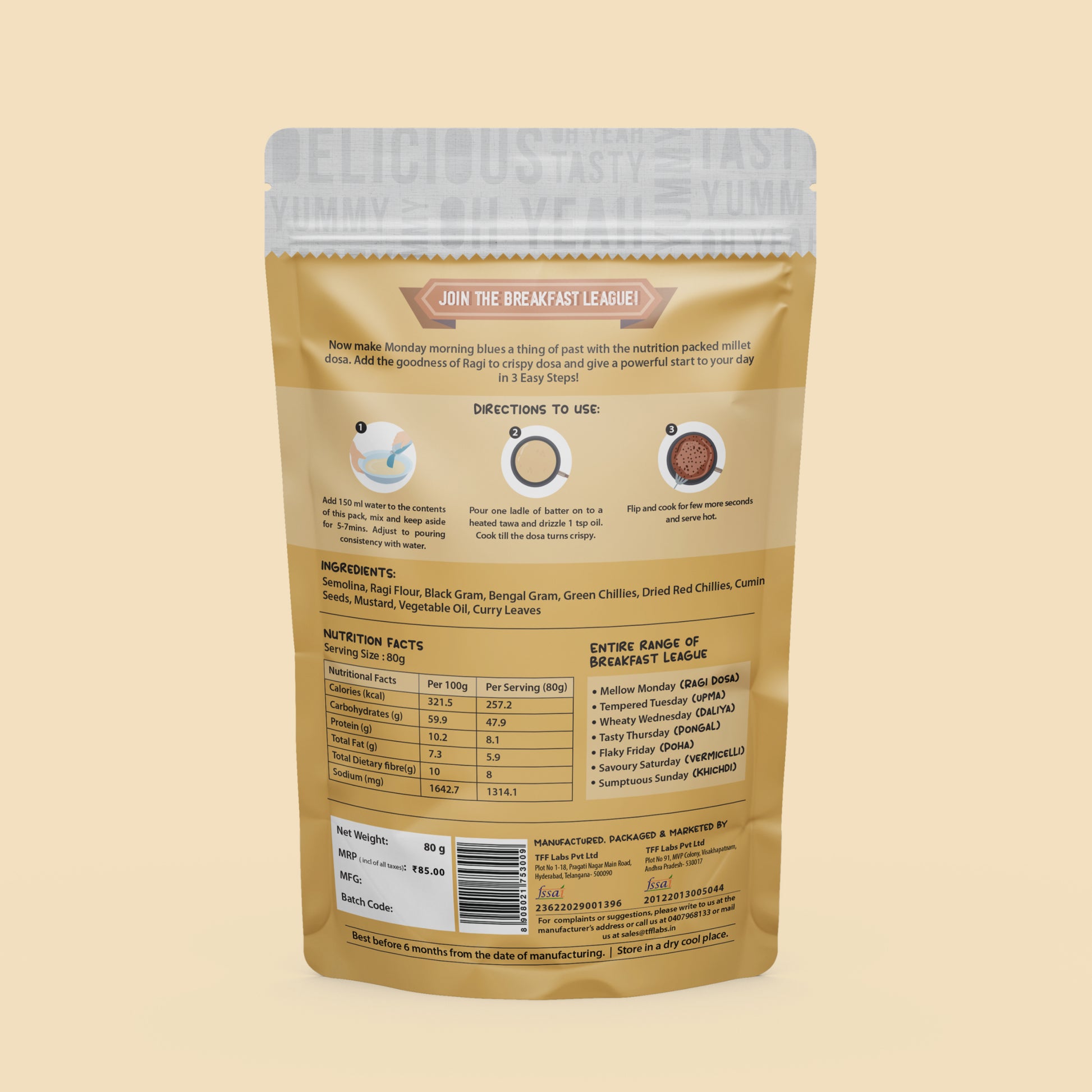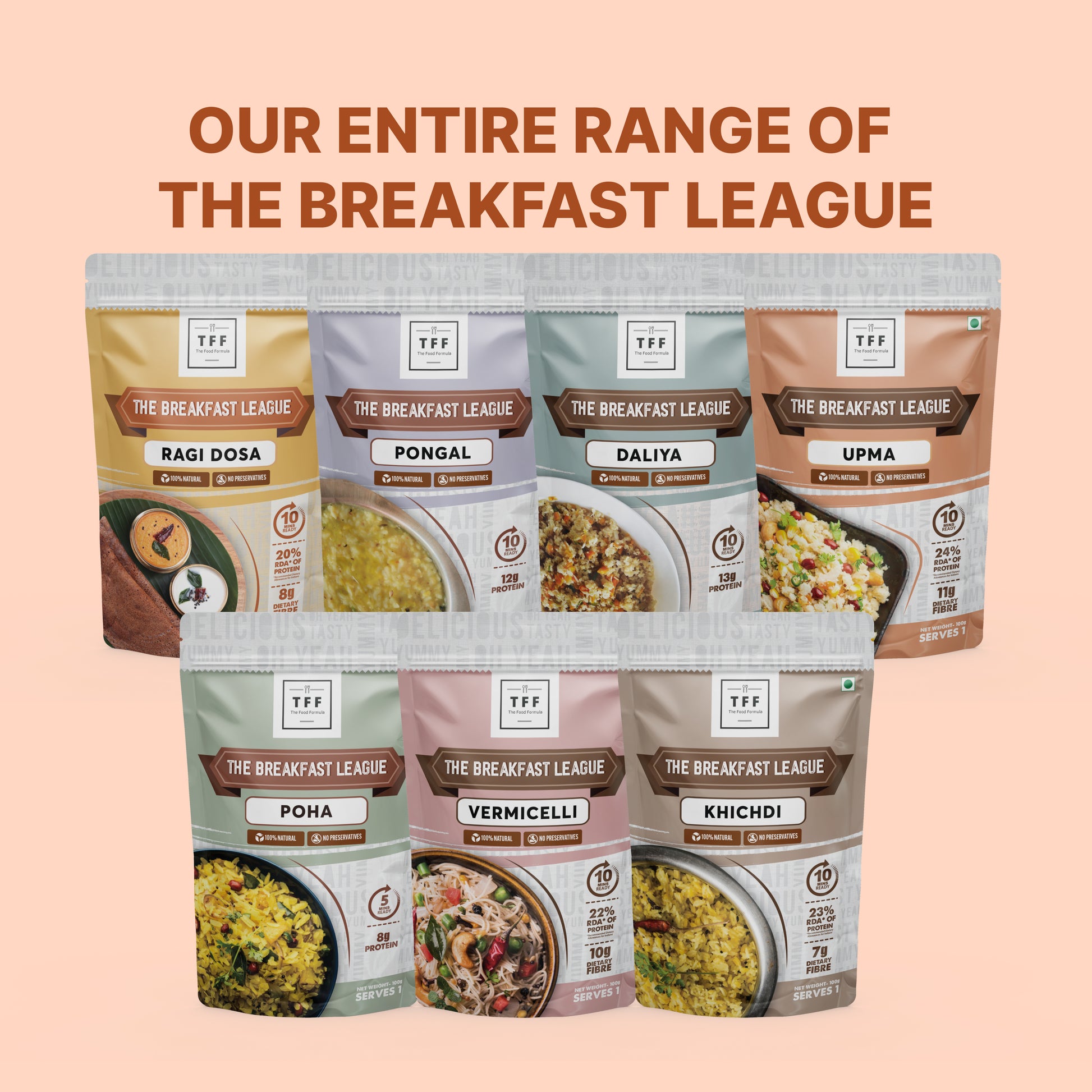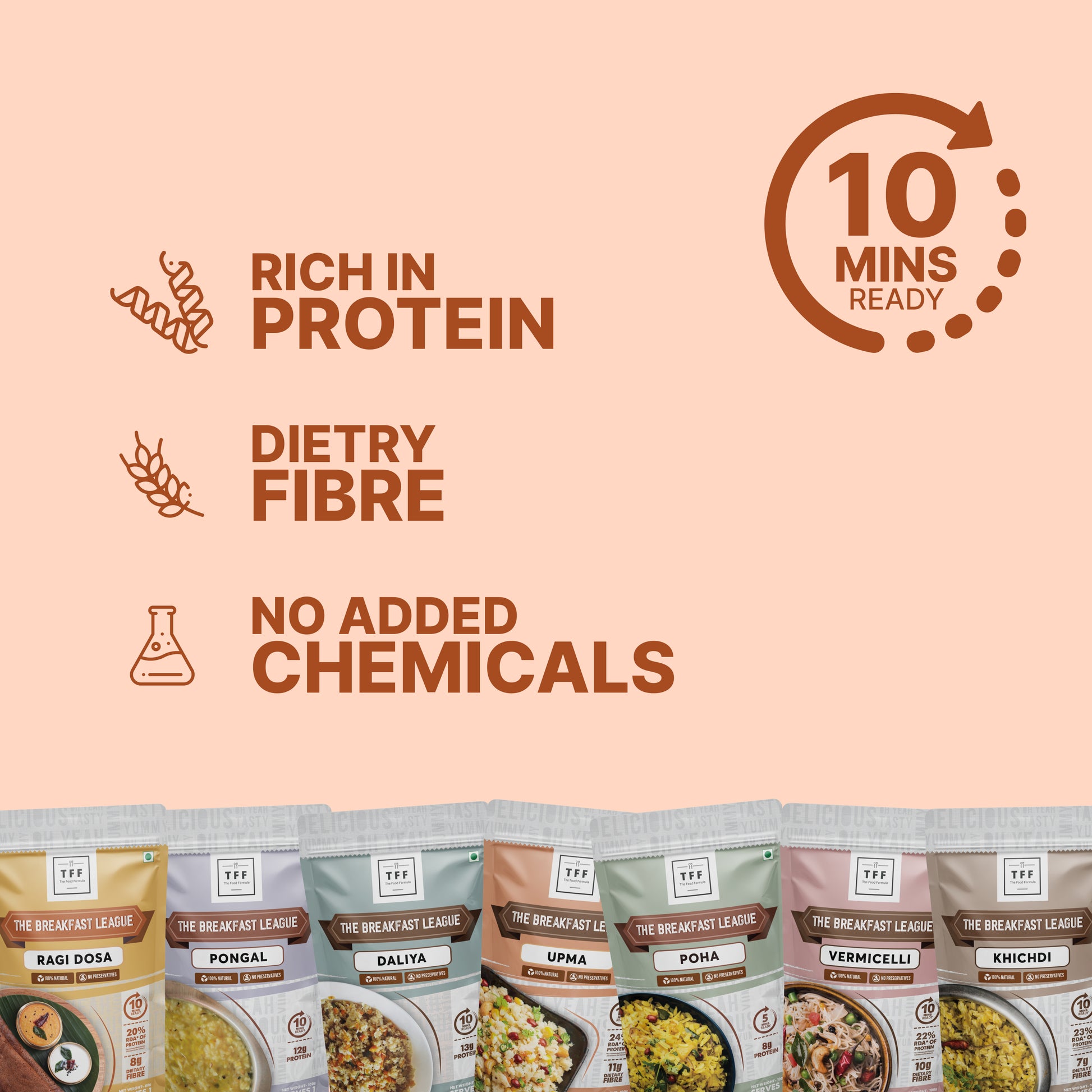 Start your mornings stress-free with our Breakfast League Ready-to-Cook Range. Designed for quick and easy preparation, these nutritious breakfast options—Ragi Dosa, Upma, Daliya, Pongal, Poha, Vermicelli, and Khichdi—bring a burst of flavor and energy to your day in just three simple steps. Immerse yourself in the variety of wholesome, delicious options and give your body the powerful start it deserves with minimal effort!